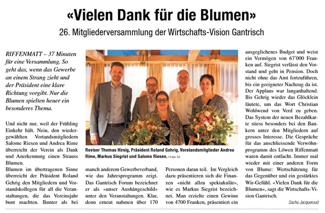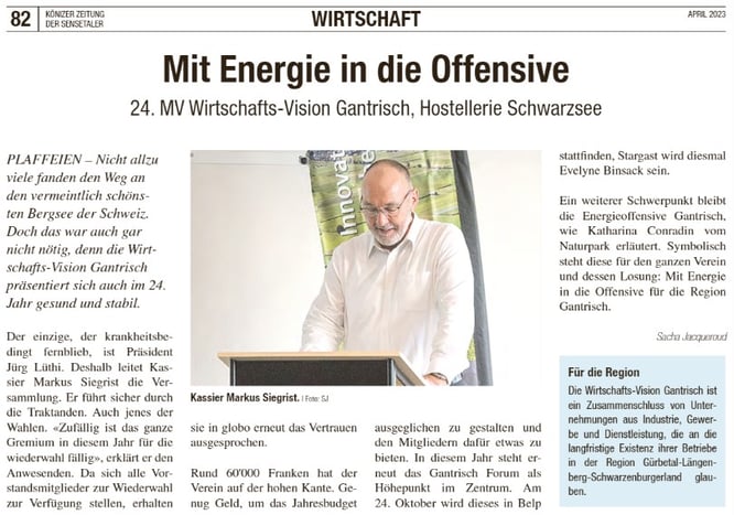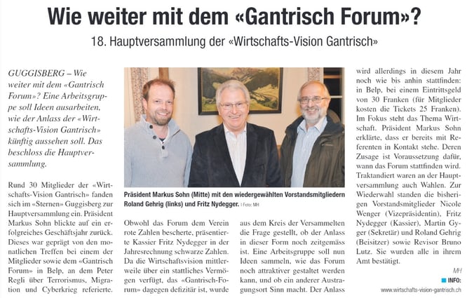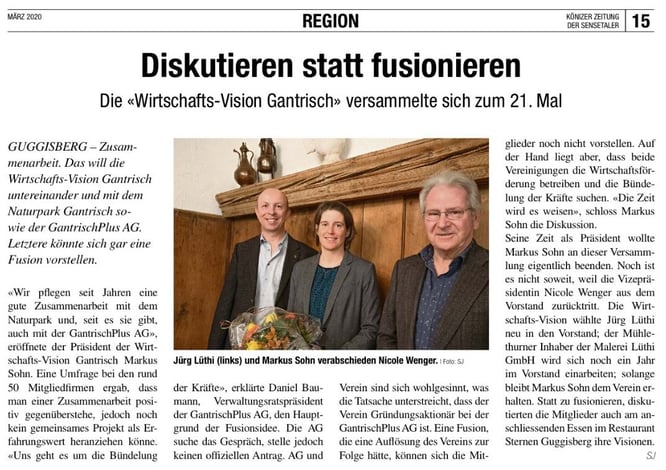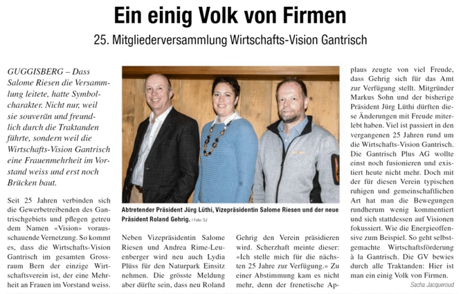 Die Wirtschafts-Vision Gantrisch (VWG) gibt es schon seit über zehn Jahren. Sie ist eine überregionale Interessengemeinschaft mit Leuten aus den Bereichen Industrie, Gewerbe und Dienstleistung. Laut Präsident Markus Sohn sind der Organisation nun bereits 46 Unternehmen angeschlossen.